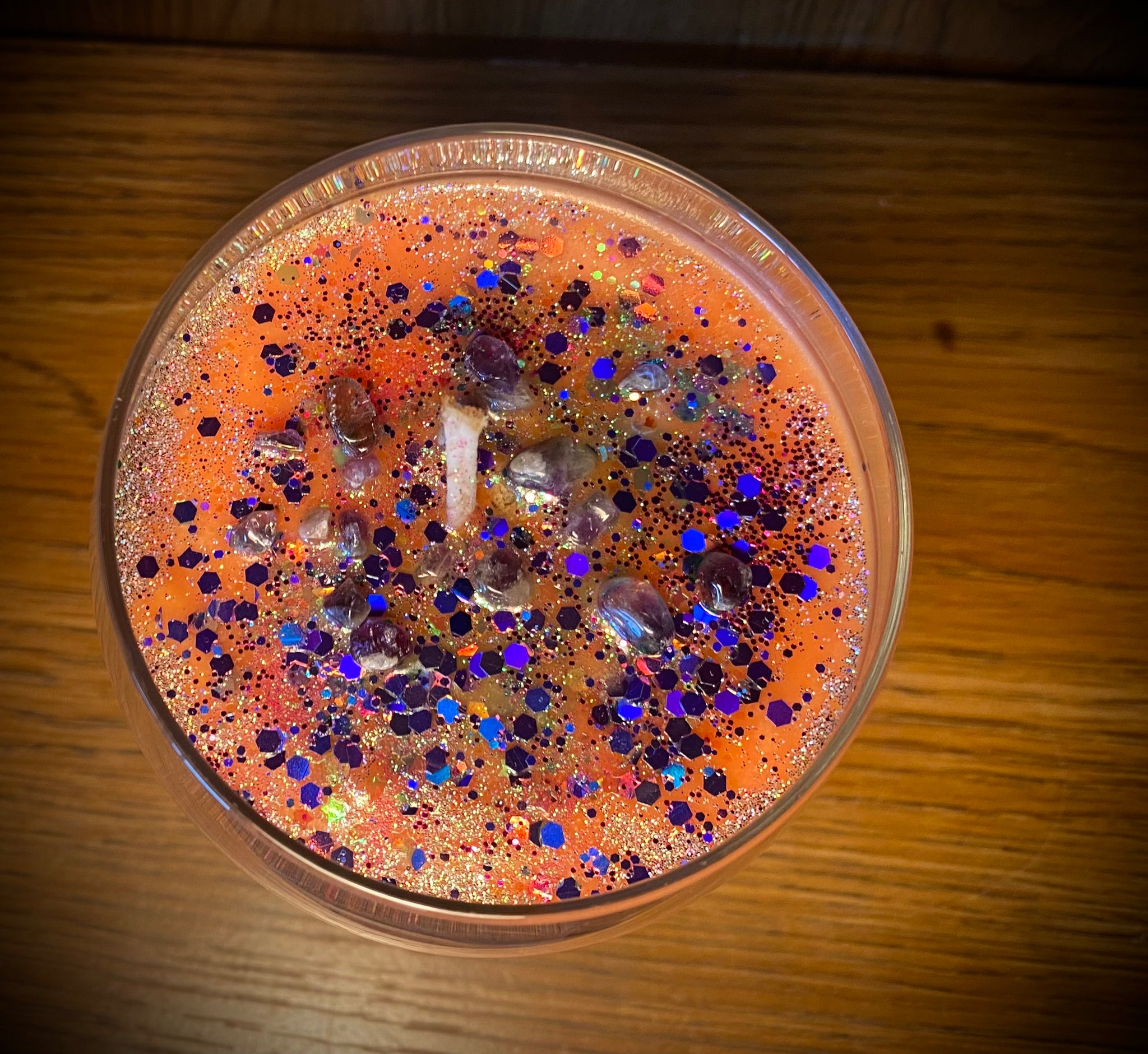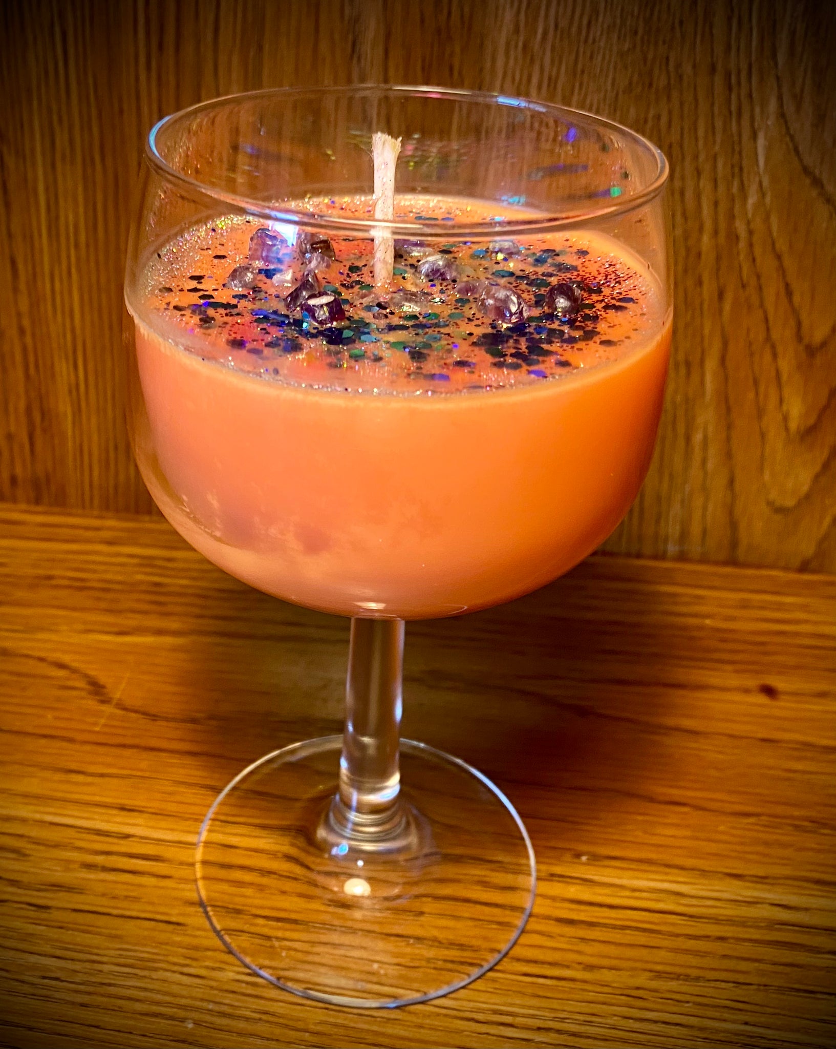 7oz of 100% soy wax in a wine glass, topped with glitter and rose quartz.