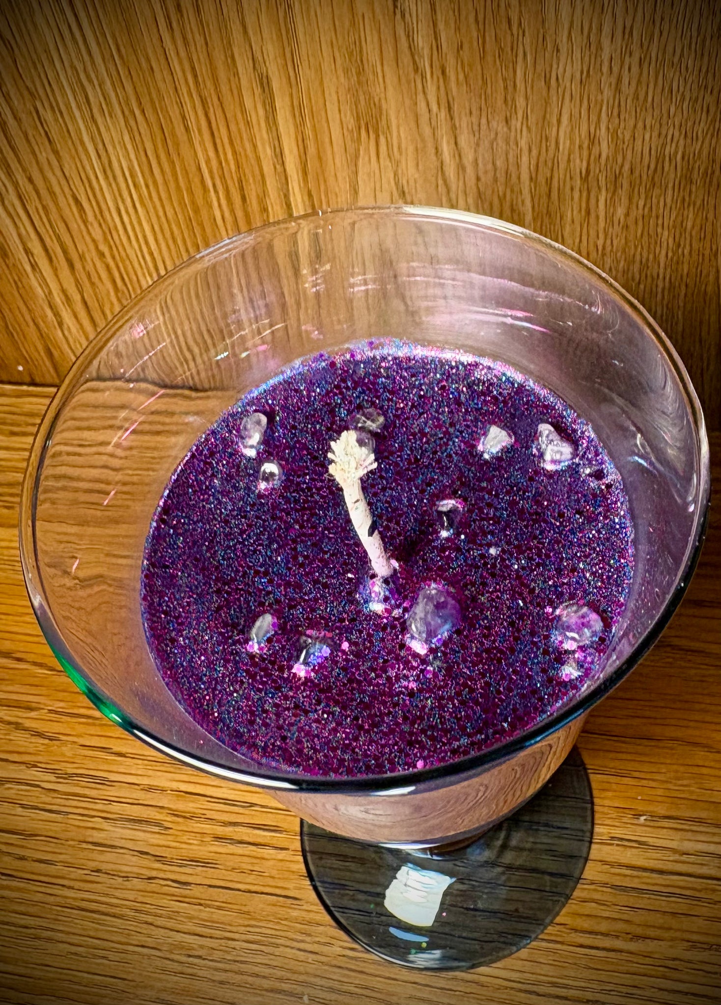 7oz of 100% soy wax in a vintage big trumpet glass,topped with Amethyst chips